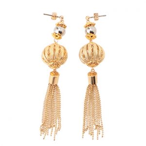 中国の伝統的な装飾ランタンをモチーフにしたピアス。動くたびに揺らめくフリンジが顔まわりを華やかに演出してくれます。肌なじみの良いメタリックカラーをベースにしているので、さまざまな方に似合うのもポイント。コーディネートにおしゃれなワンアクセントを加えたいときにぴったりです。
