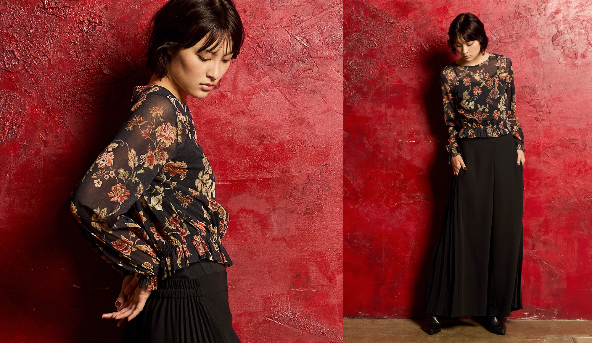 ヴィンテージライクなフラワープリントのブラウスは、ウエストのシャーリングが作る立体的なフォルムが華やか。ボリューミーなワイドパンツをすっきりとバランス良く見せてくれる。 VINTAGE FLOWER DANTSU PRINT NETTING BLOUSE(15275110) col.79 ¥37,400 POLY CREPE PANTS(15276031) col.02 ¥64,900