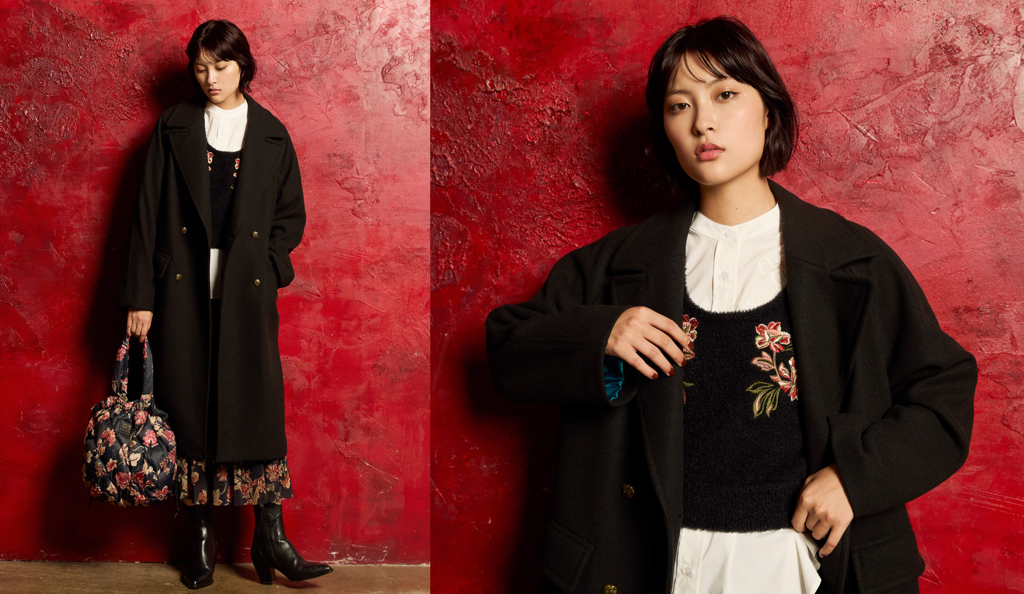 ヴィンテージライクな落ち着いた色合いが美しいフラワーモチーフは、中国の伝統的な織物・緞通からのインスピレーション。ショート丈のベストやスカート、リバーシブルのダウンバッグで散りばめて華やかに。ウールのようなリアルな風合いがリュクスなジャージー素材のコートをはおって、クラシカルな気品をプラス。 SMART WOOL TOUCH COAT(15275154) col.02 ¥79,200 FLOWER EMBROIDERY KNIT VEST(15275172) col.02 ¥23,100 WHITE LINE NO-COLLAR DRAGON EMBROIDERY BLOUSE(15275816) col.01 ¥17,600 VINTAGE FLOWER DANTSU PRINT NETTING SKIRT(15275120) col.79 ¥42,900 TAION COLLABORATION FLOWER PRINT BAG(15282080) col.06 ¥13,200