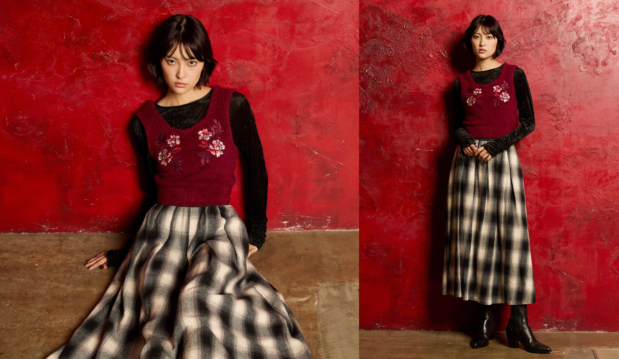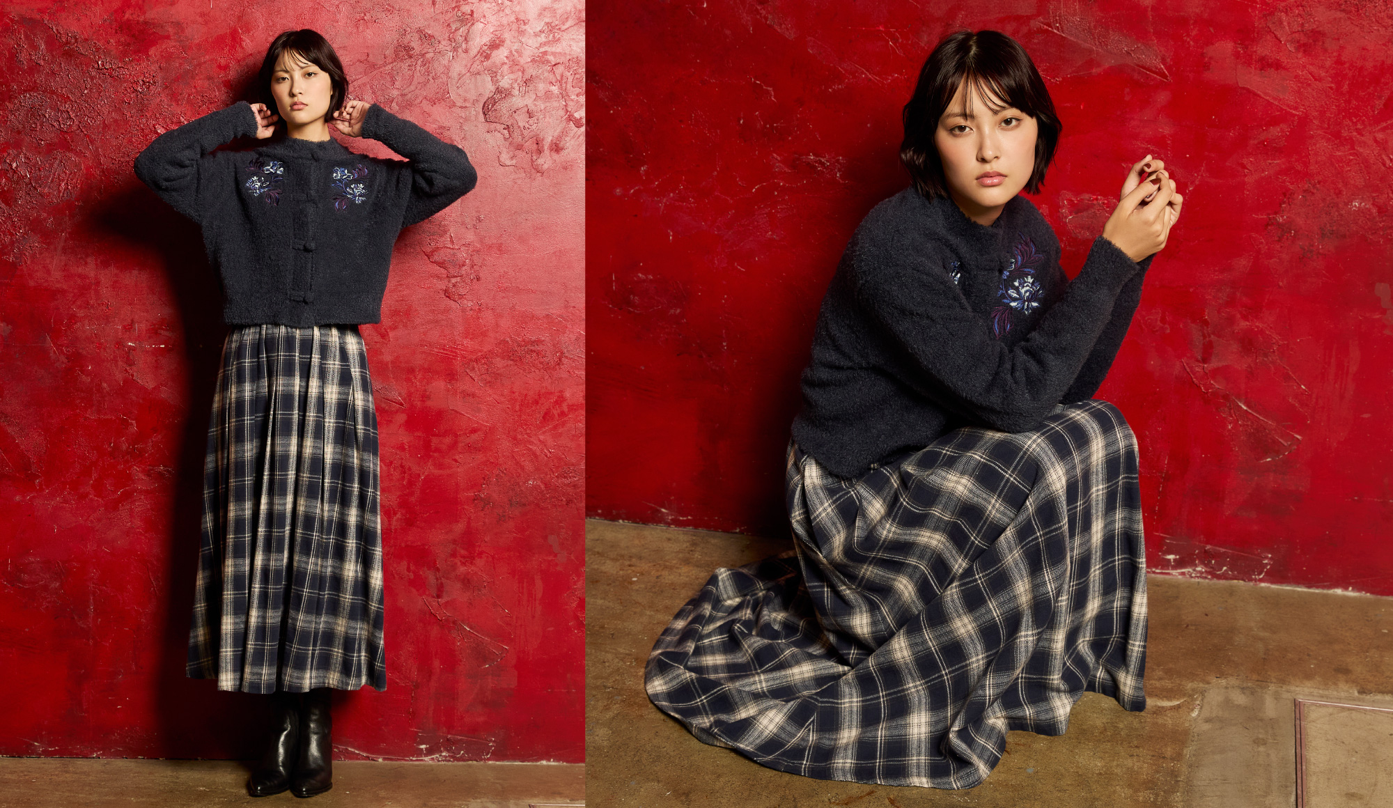 緞通からインスパイアされたフラワープリントのモチーフを刺繍したカーディガンは、毛足のある素材でふんわりあたたかな着心地が魅力。チェックスカートを添えてクラシカルに。 FLOWER EMBROIDERY KNIT CARDIGAN(15275171) col.75 ¥28,600 SHEER VELOR BLOUSE(15275012) col.02 ¥19,800 WHITE LINE CHECK TACK SKIRT(15275121) col.70 ¥25,300