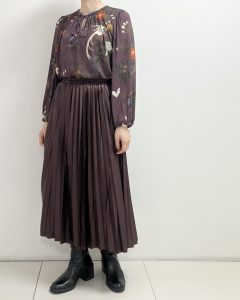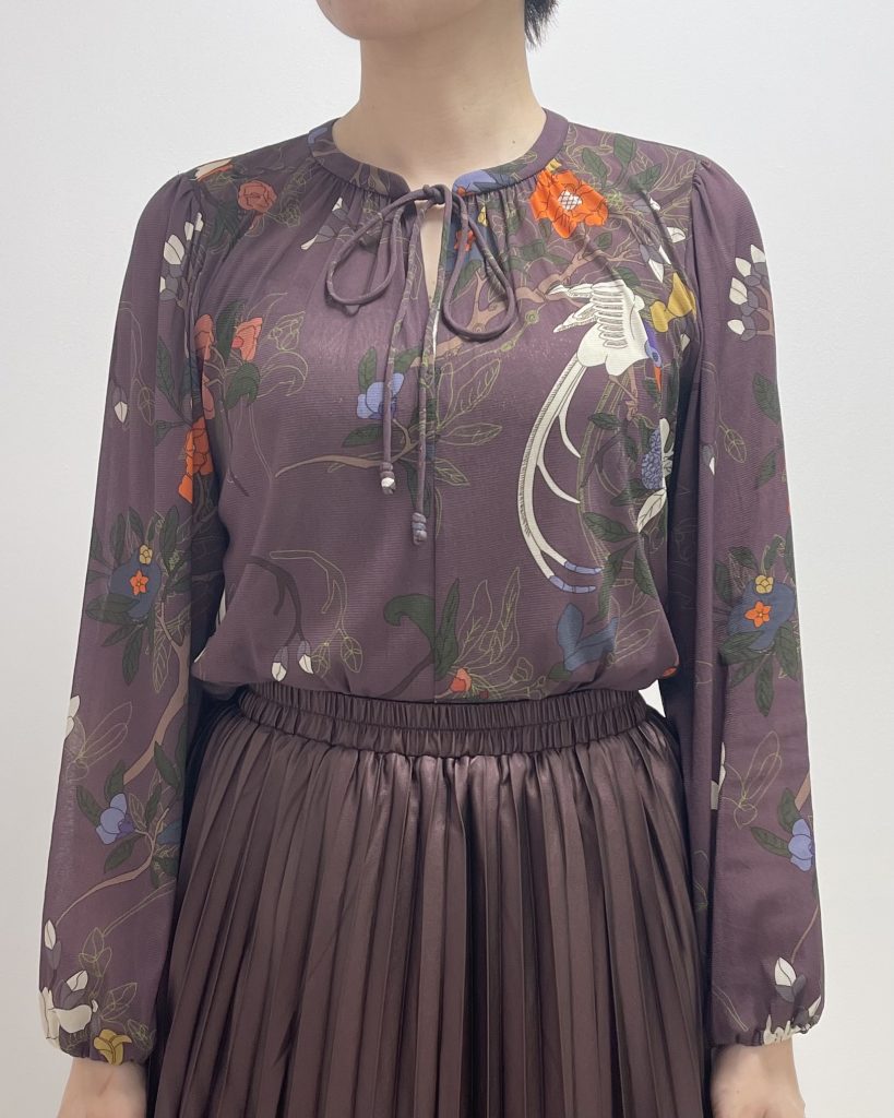 ブラウンパープルのカラーが目を惹くフラワープリントのブラウスは