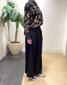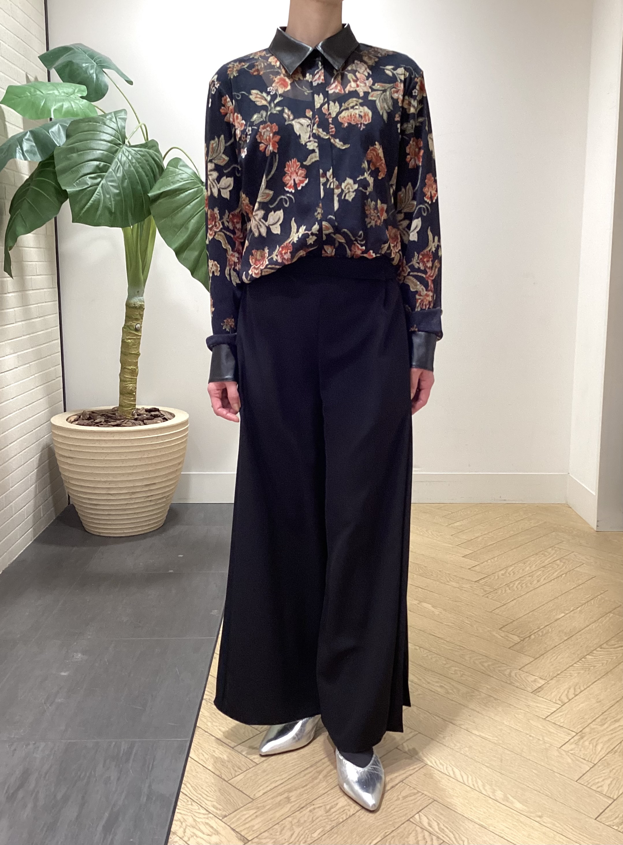 両脇がプリーツになった動きのあるパンツでシックに合わせてみました💐