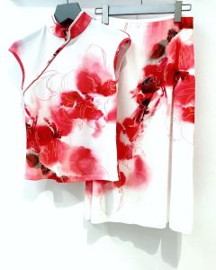 鮮やかに桜花を描いたアートピースのように美しいプリントが印象的なセットアップ