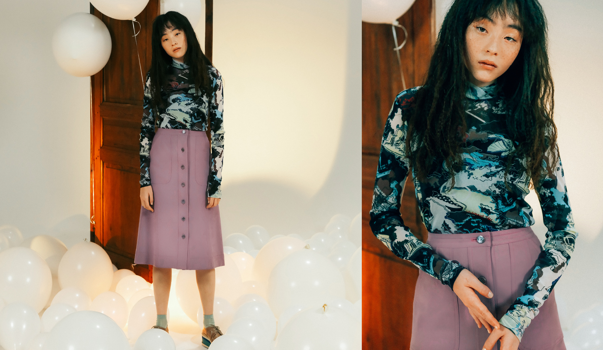 香港のランドマークに、ティーポットや鳥かご、ライオンドアノッカー、ドラゴン、フェニックスなどをミックスしたシティカモフラージュ柄は、纏うたびに高揚感が味わえるポップさが魅力。切り替えステッチと並んだフロントボタンがかわいいカラースカートで柄を主役に。 CITY CAMOUFLAGE PRINT STRETCH NETTING BLOUSE(12176110) col.06 ¥26,400 WASHABLE 2WAY TWILL SKIRT(12175121) col.81 ¥30,800